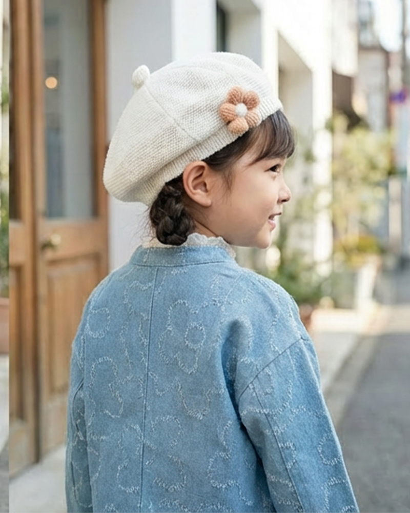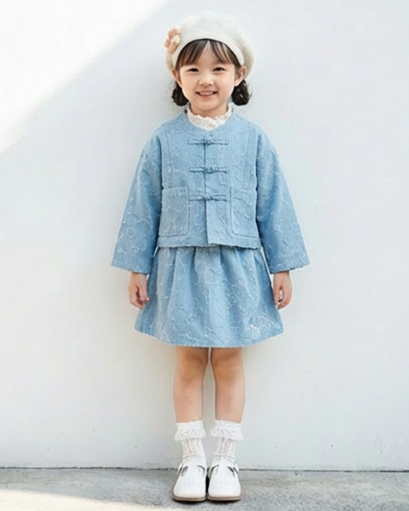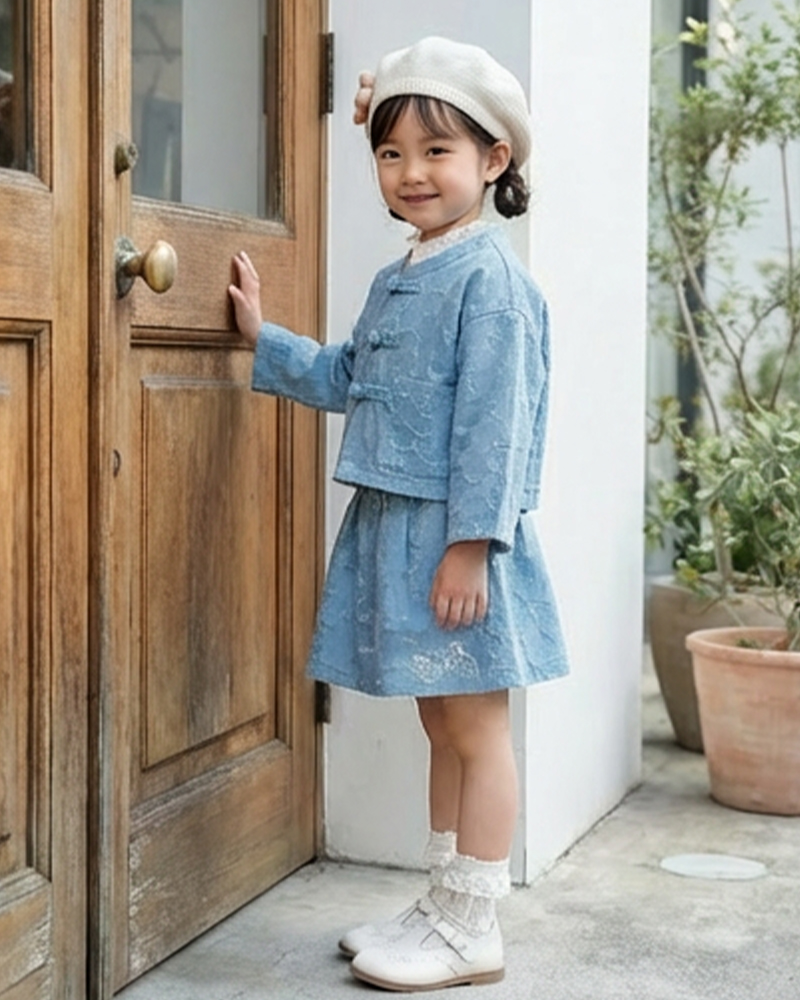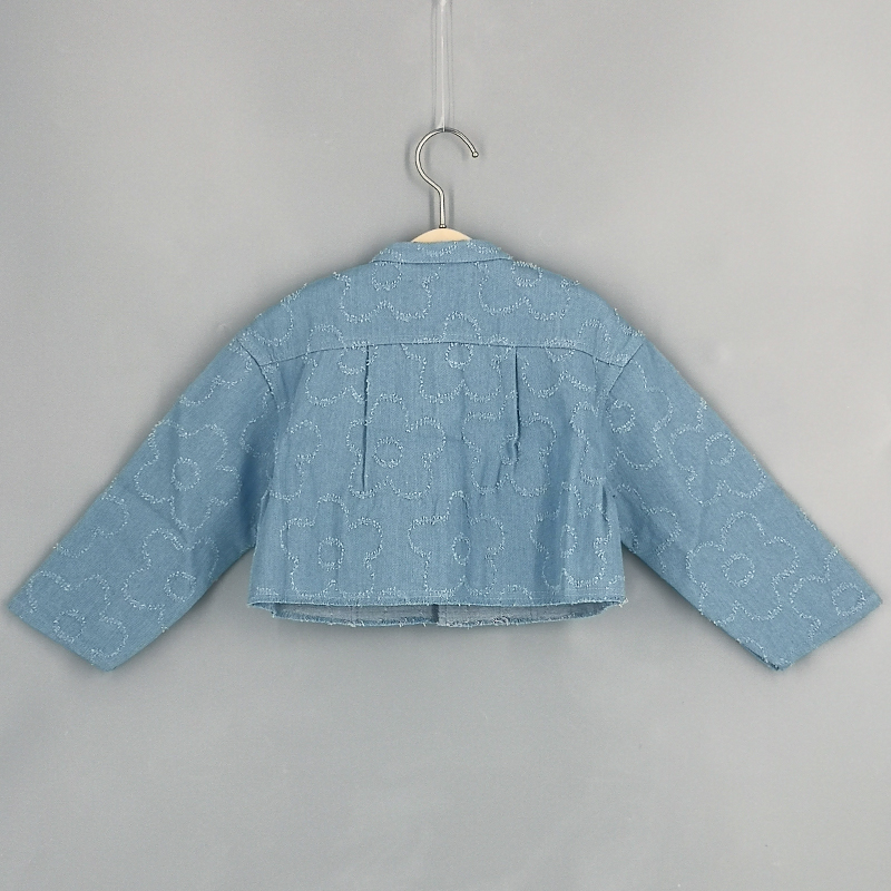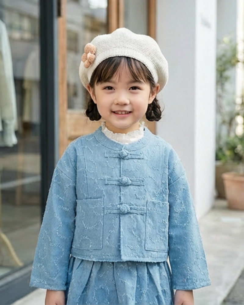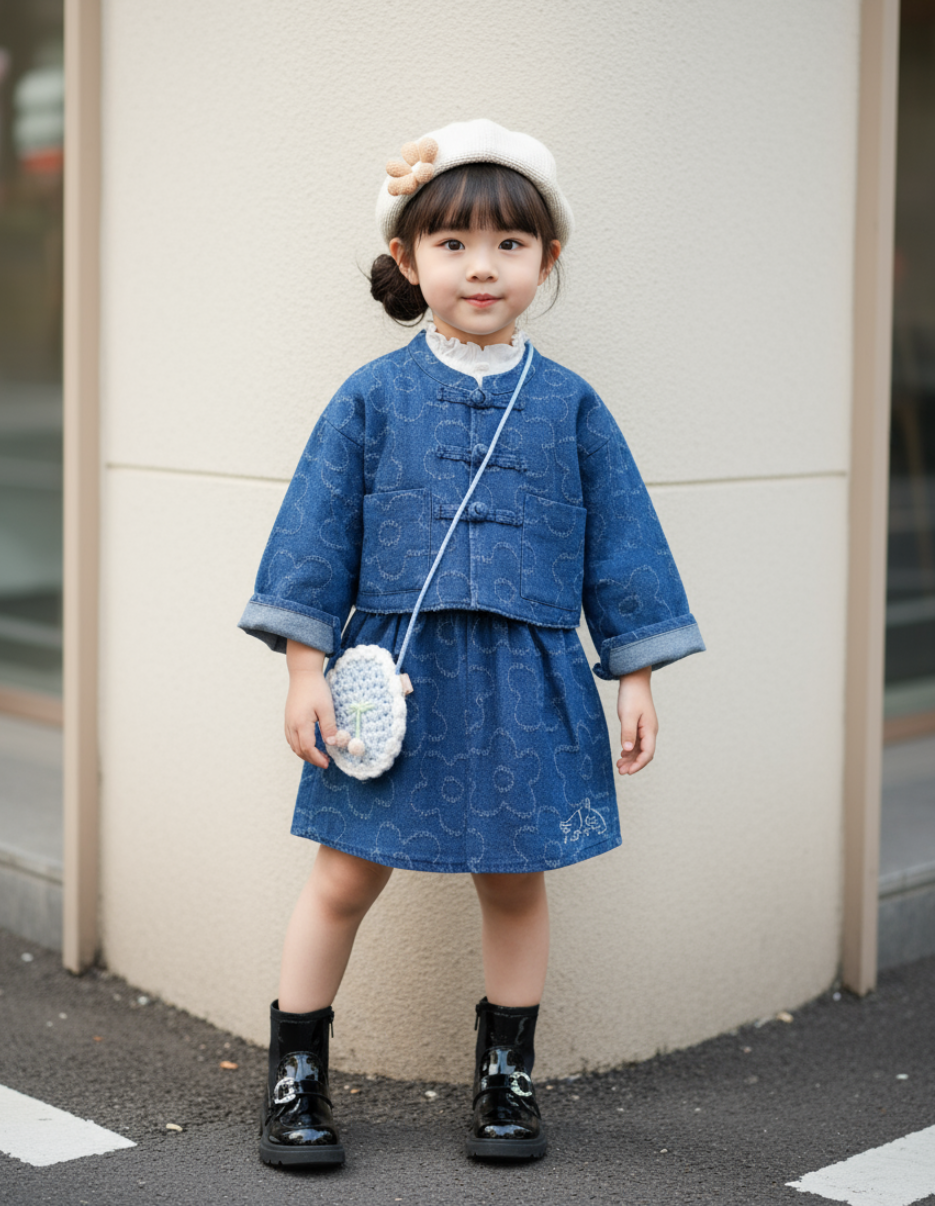 圓領, 中國結鈕扣, 前方口袋, 特色花花圖案布, 流蘇邊, 短身衫款, 牛仔布
