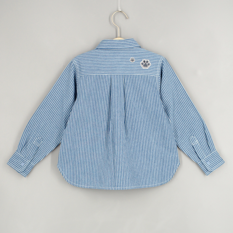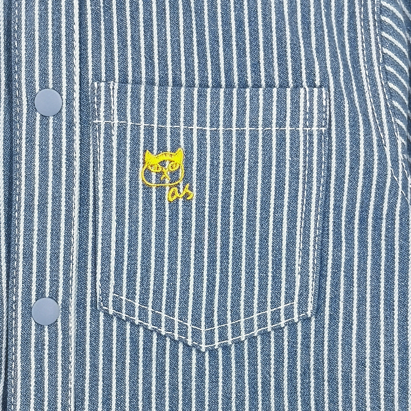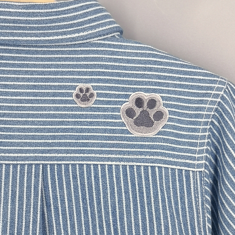 牛仔布料, 貓咪刺繡圖案, 胸袋, 前中鈕扣開合, 背面貓貓腳印布貼, 壓褶細節, 條紋圖案