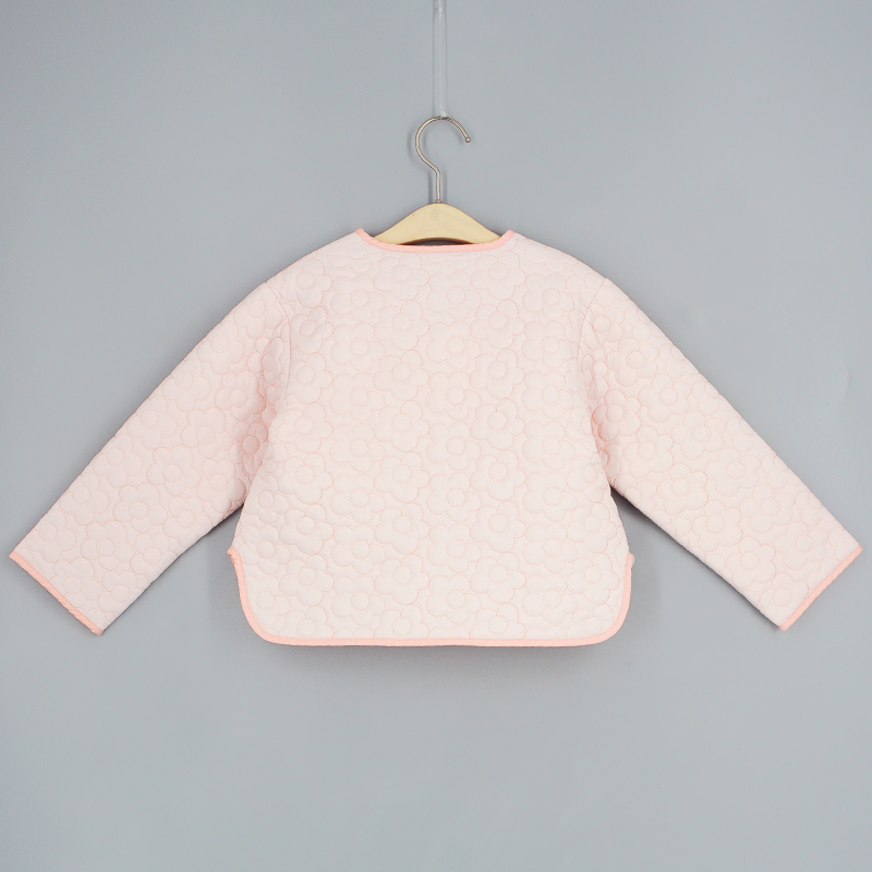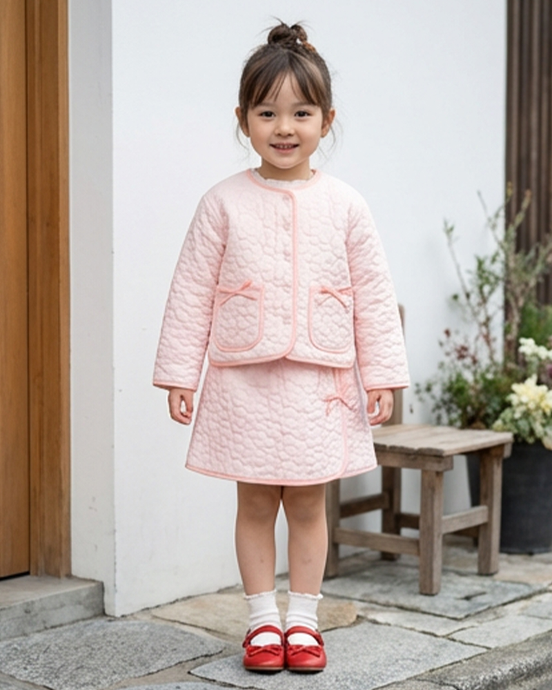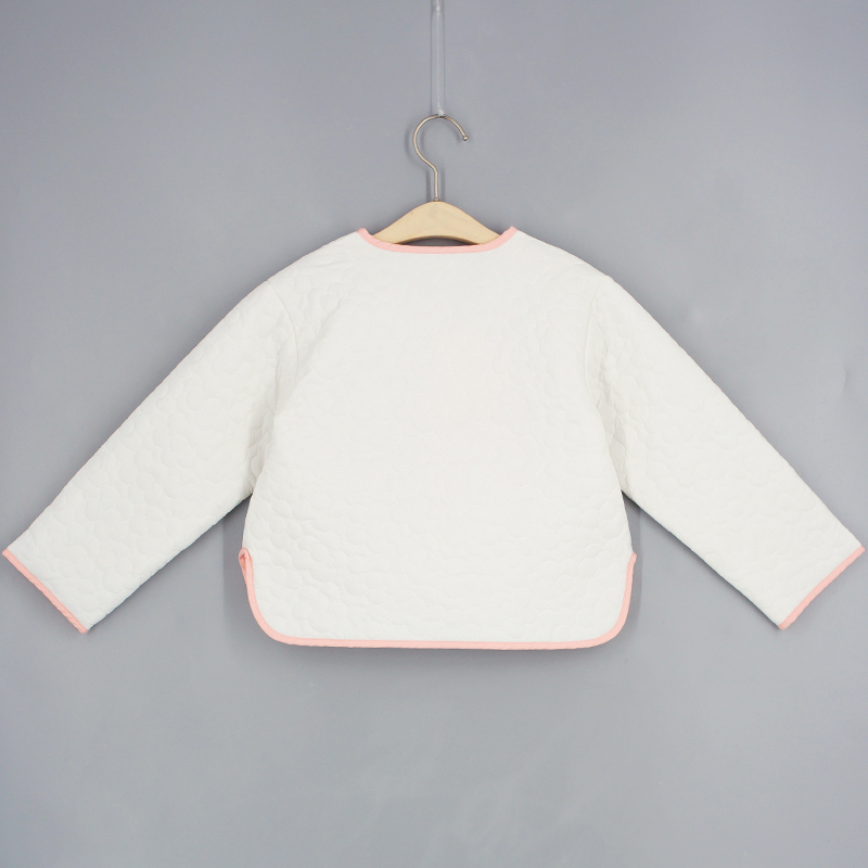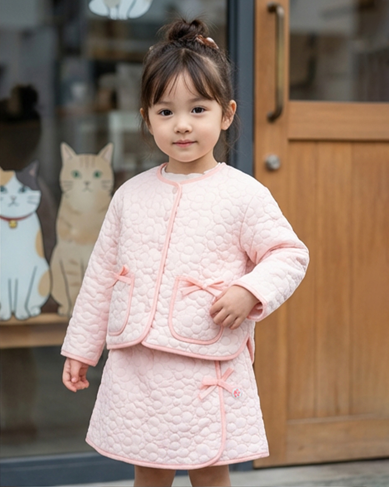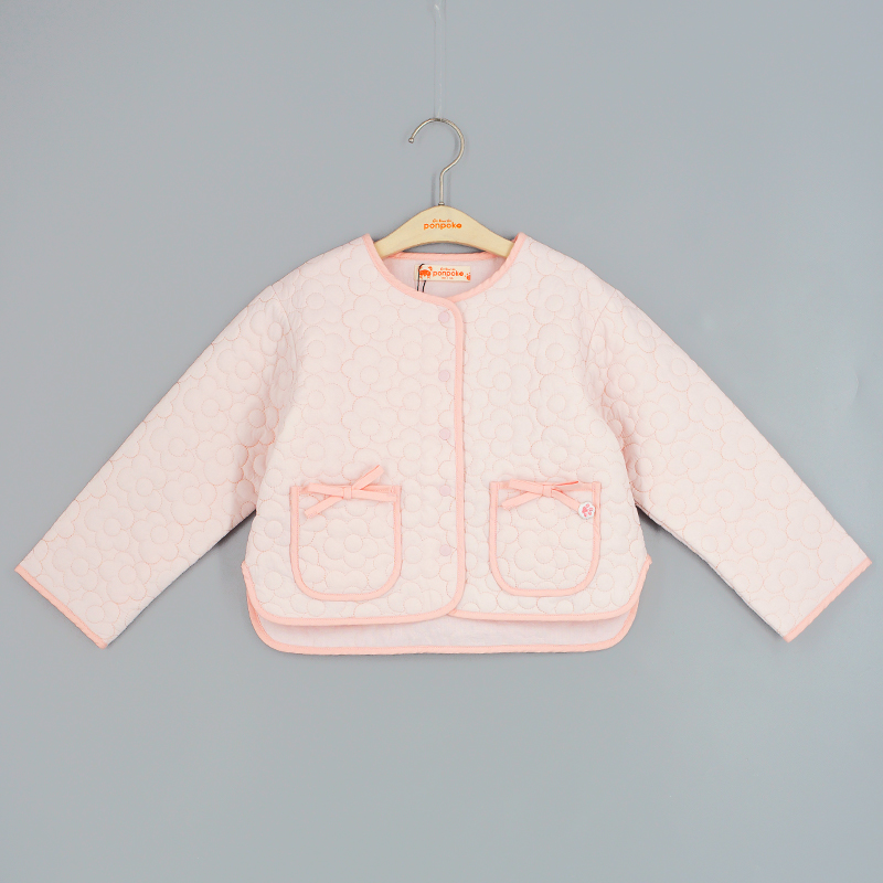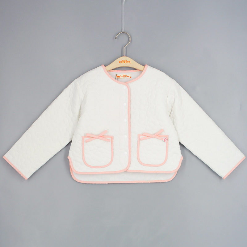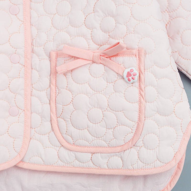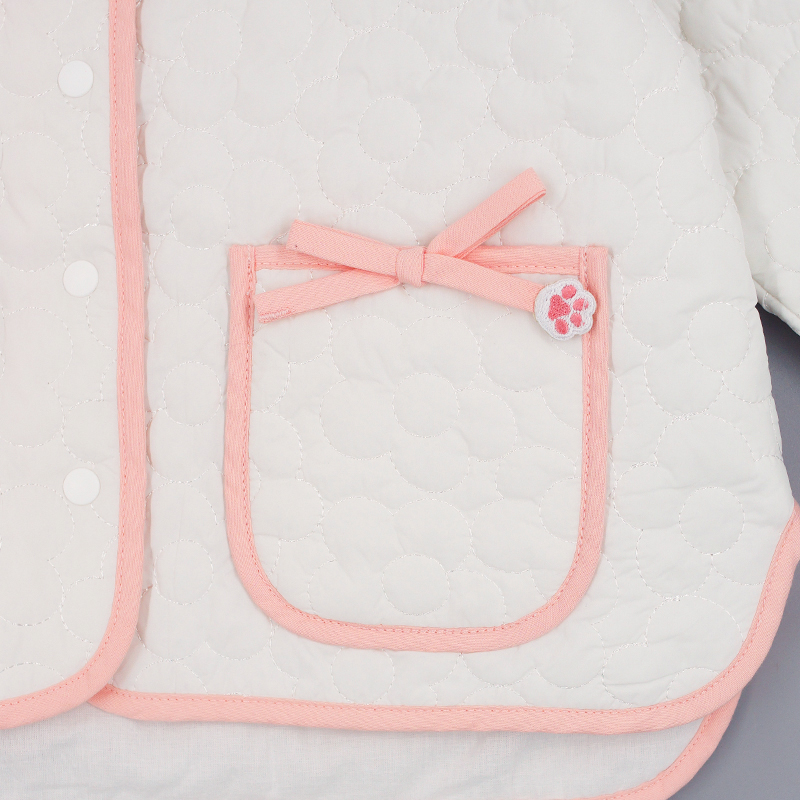 圓領, 間棉設計, 前中鈕扣開合, 兩側口袋, 蝴蝶結, 貓咪腳印裝飾, 撞色包邊, 花花圖案間棉布, 前短後長衫腳