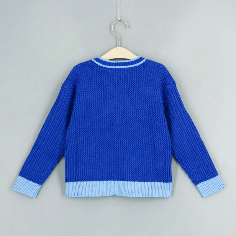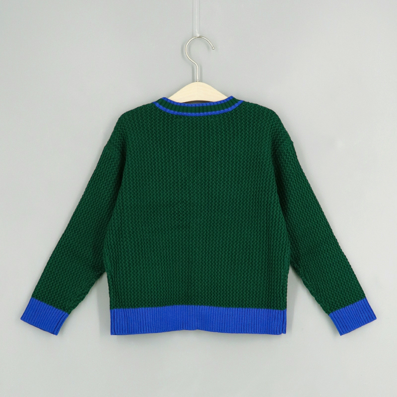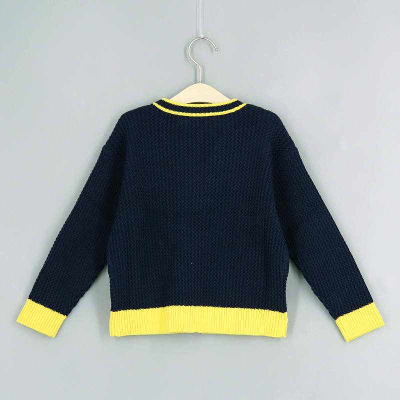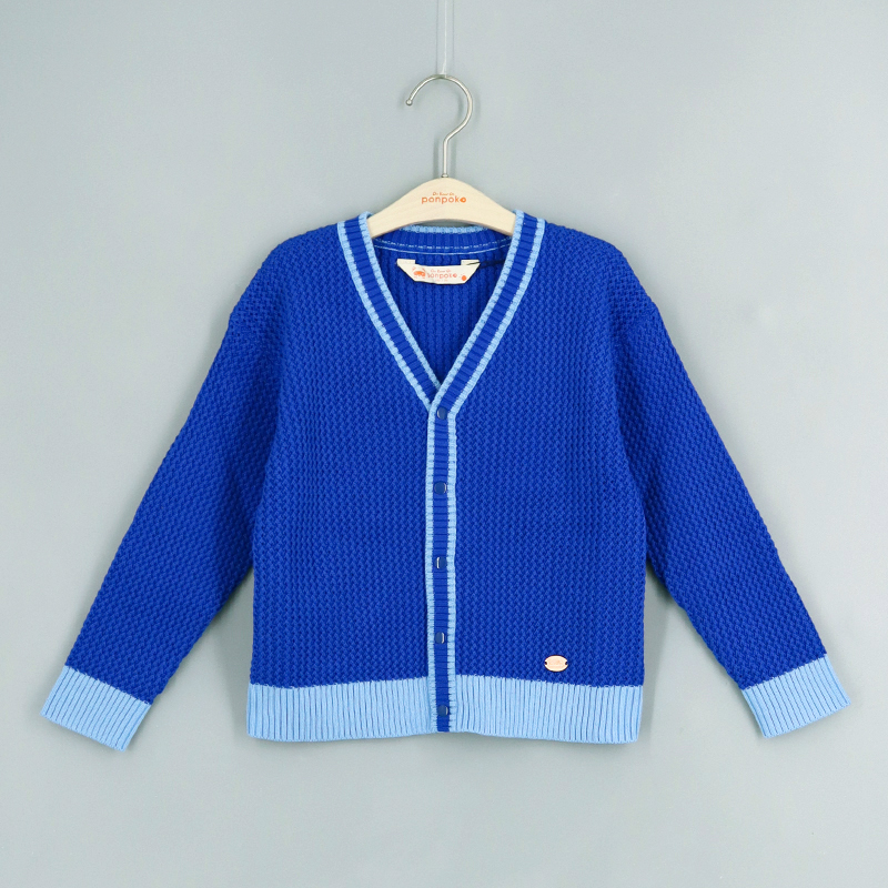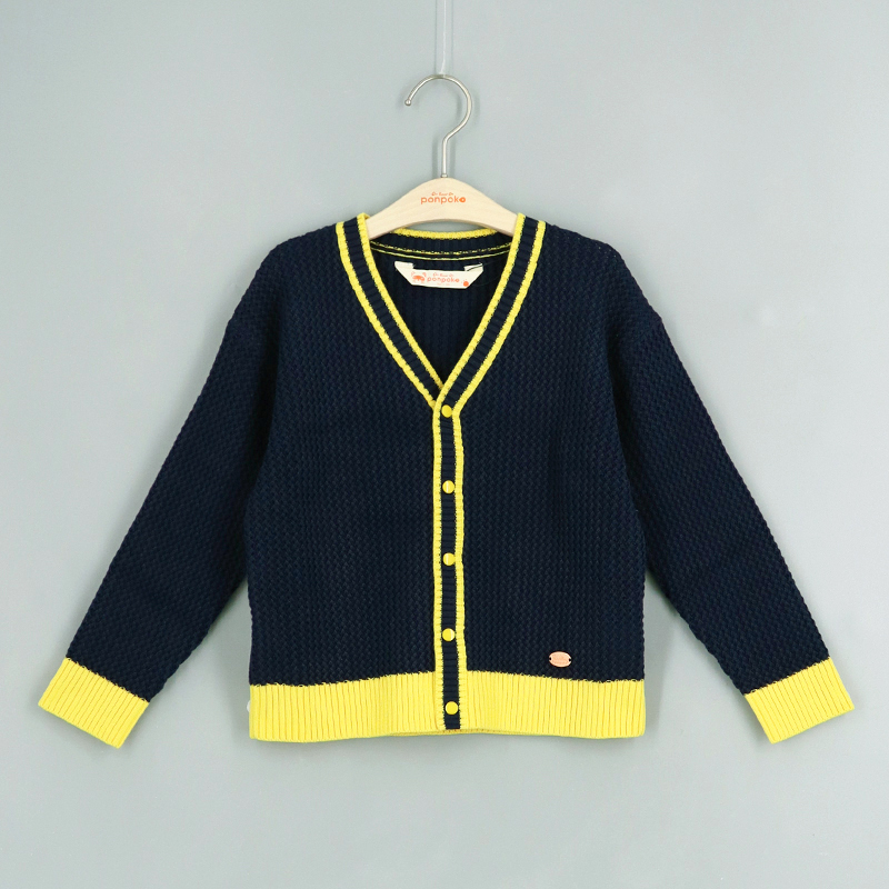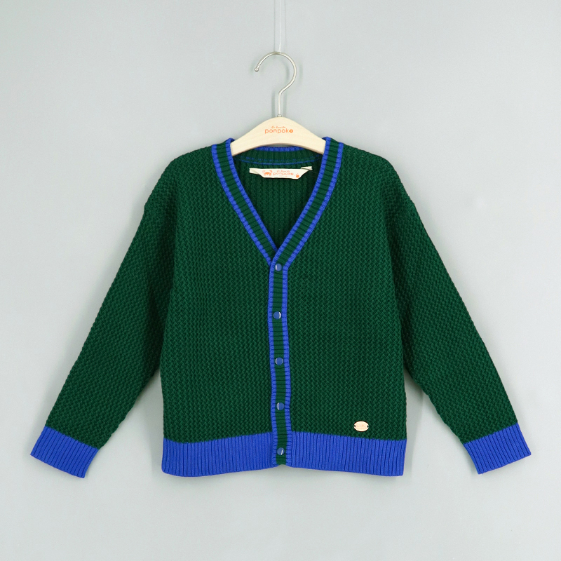 V領, 撞色羅紋手袖及衫腳, 前中鈕扣開合, 針織波浪紋, 品牌金屬章, 合身款式, 撞色風格, 全棉