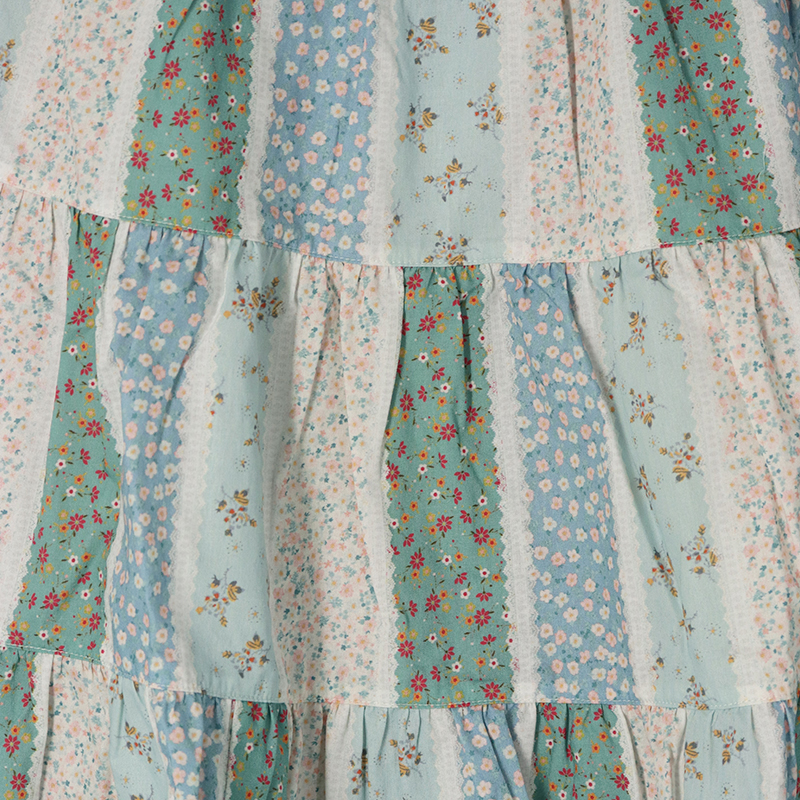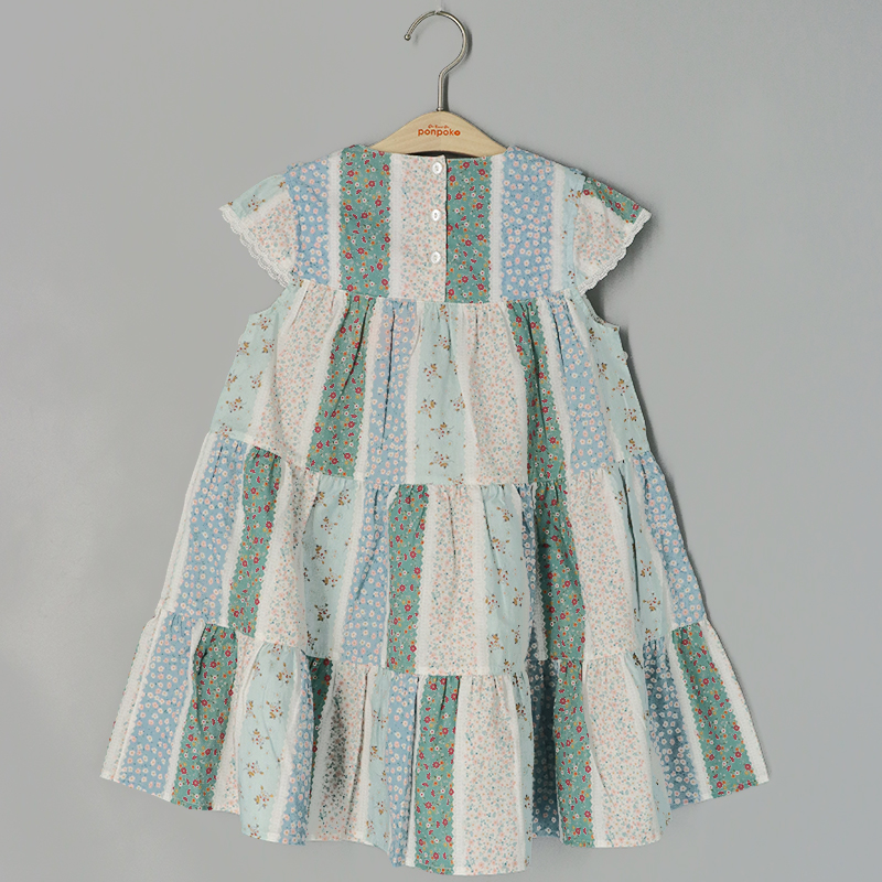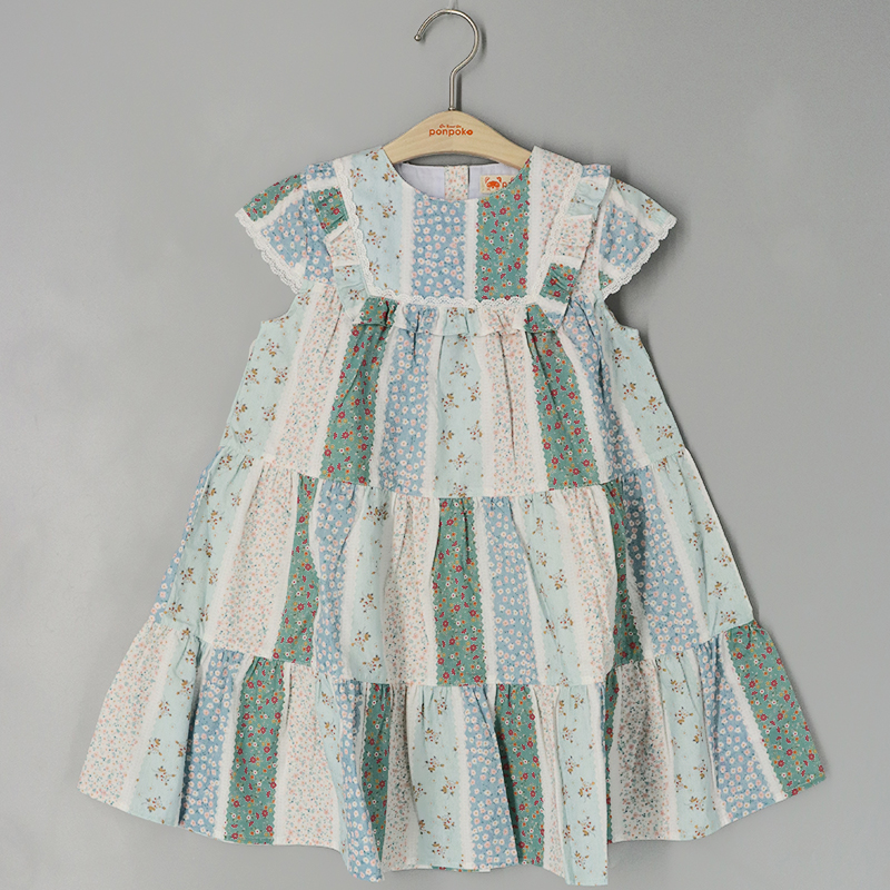 圓領, 碎花設計, 拼布風格, 蛋糕裙設計,蕾絲邊裝飾