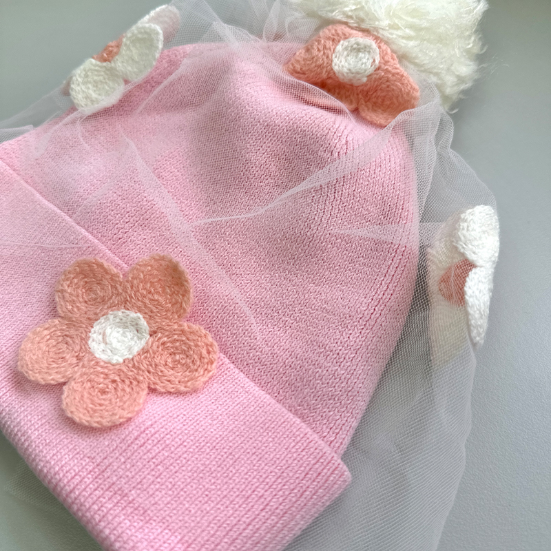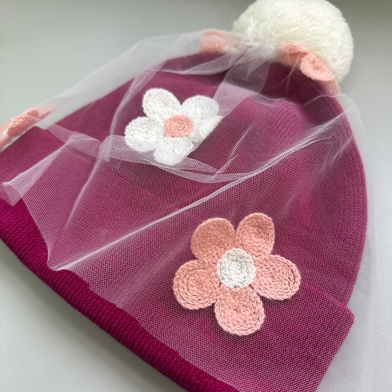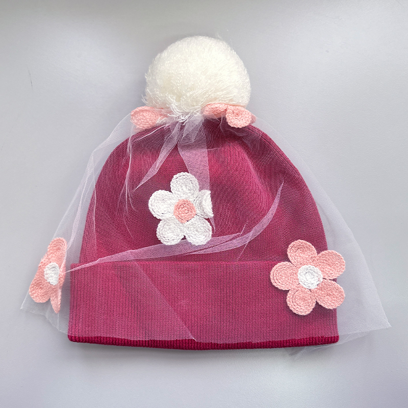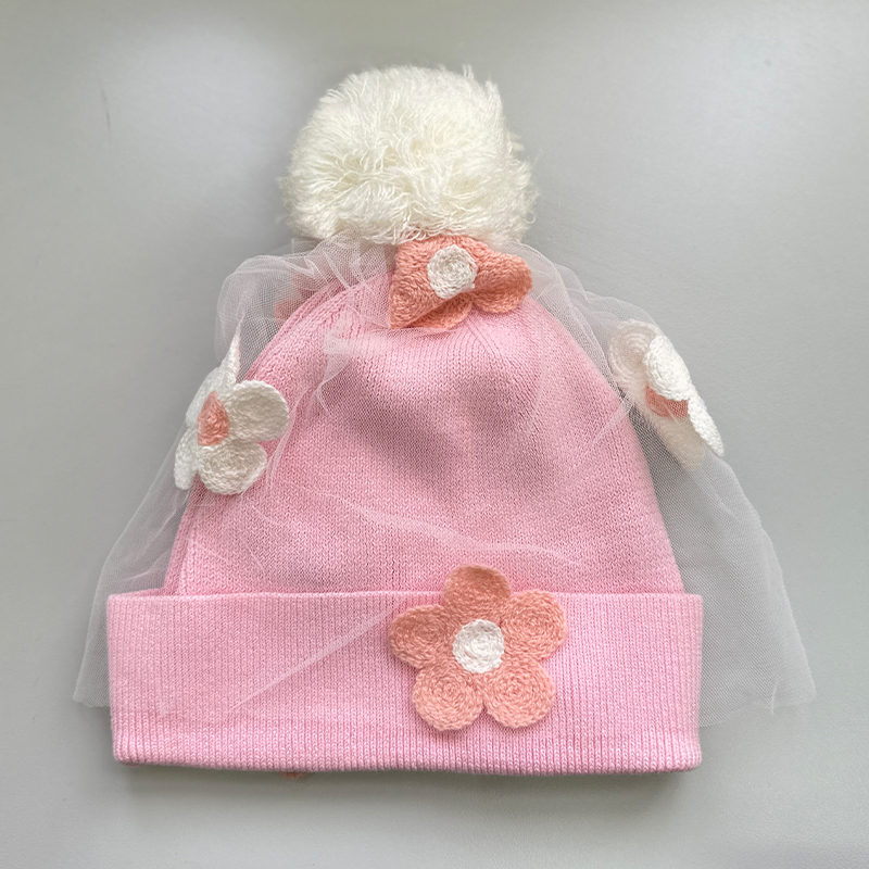 羅紋邊, 立體花花圖案, 毛球裝飾
